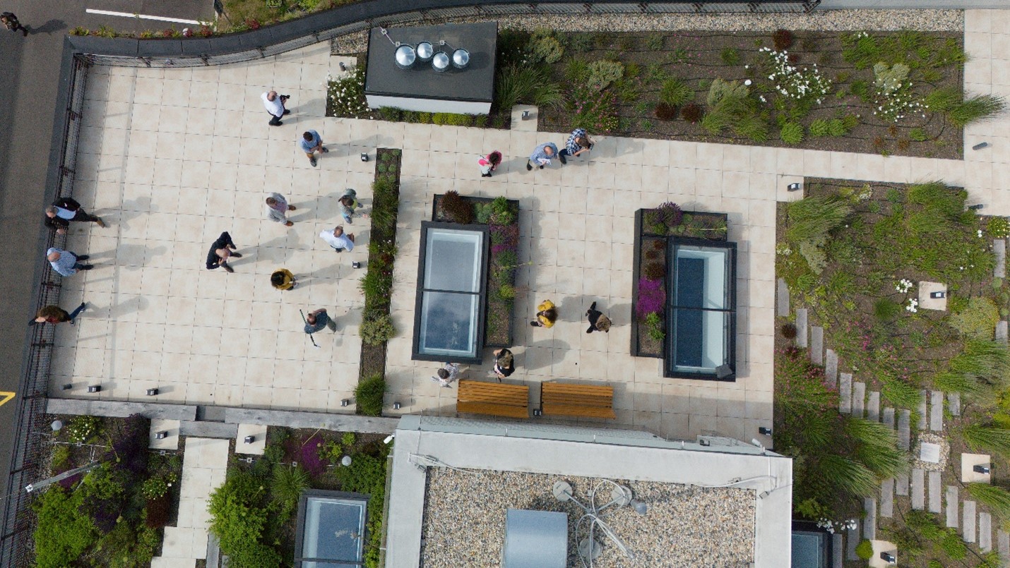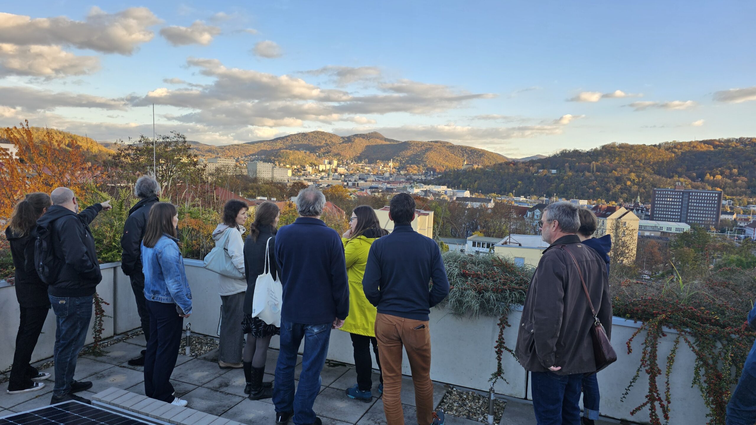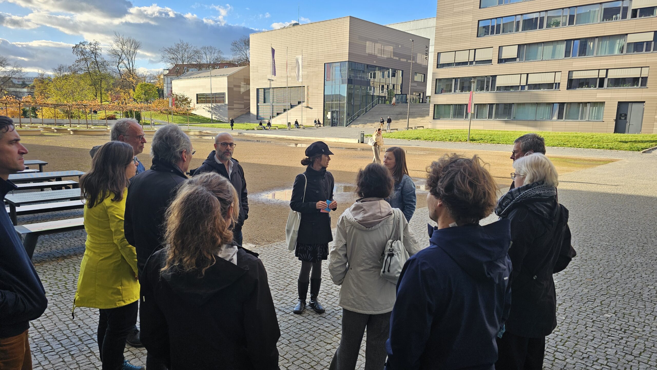 Původně plánovaná prohlídka laboratoře se z časových důvodů bohužel nemohla uskutečnit. Místo ní byla účastníkům nabídnuta komentovaná prohlídka inovativních vodohospodářských zařízení v areálu univerzity. Představeny byly mimo jiné systémy mokřadní filtrace pro přirozené čištění vody, zelené střechy a fasády, a také technické řešení opětovného využití vyčištěné vody pro splachování toalet. Tato zařízení názorně ukazují potenciál integrovaných přístupů k udržitelnému nakládání s vodou.